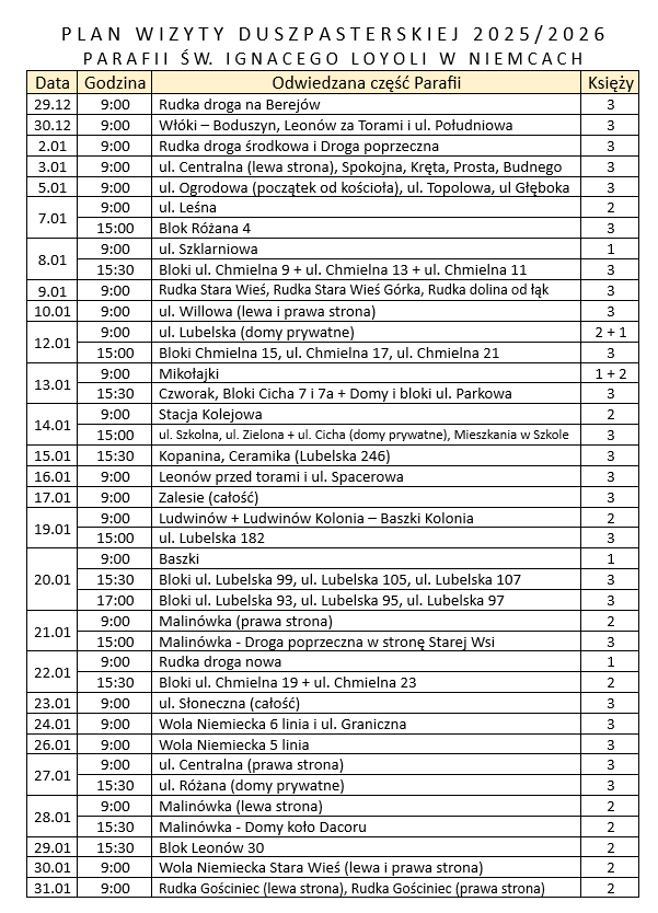 – oznaczenie w ilości księży 2+1 oznacza, że zacznie kolędę 2 księży a jeden dotrze później, gdy wróci z katechezy.